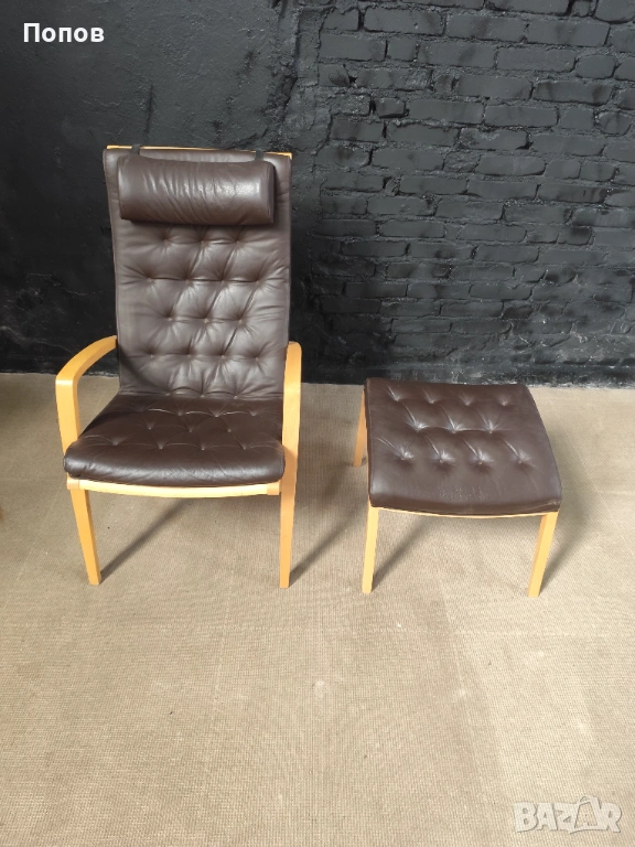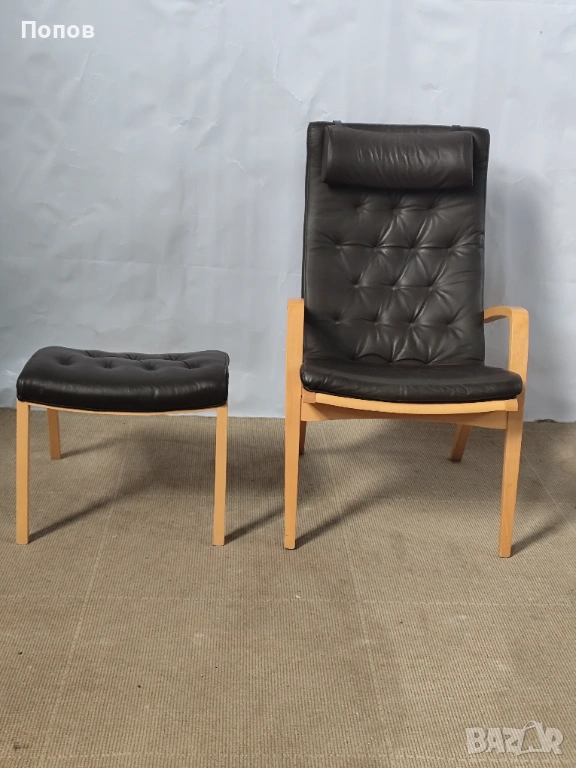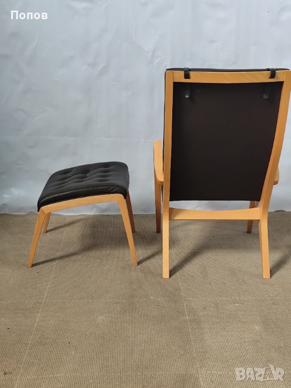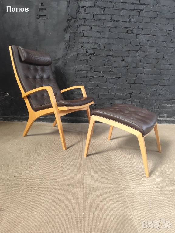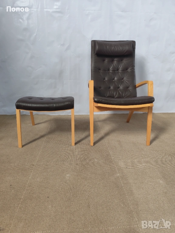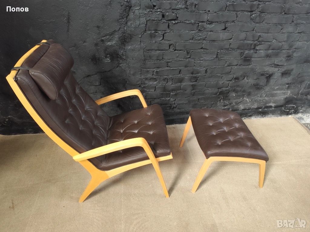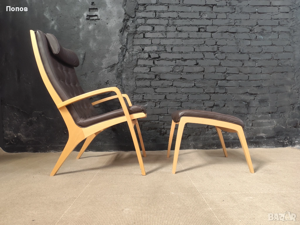 Якоб Берг за Schou Andersen Møbelfabrik. Фотьойл с табуретка от бук, тапицерия от кафява кожа Sierra. Перфектно състояние само за колекционери