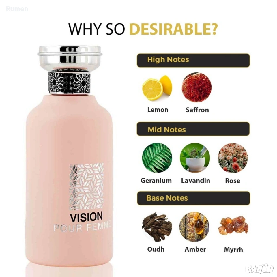 Оригинален Арабски парфюм Vision Pour Femme Eau De Parfum 100ml Spray. Цитрусова свежест: Началните нотки са освежаващи и съдържат цитрусови нюанси, като лимон и бергамот, които придават енергия и блясък на аромата. Цветя и цветя в нюанси: Сърцевината на Vision Pour Femme Eau De Parfum разкрива изтънчена флорална палитра, включително роза, жасмин, и ирис. Тези нотки придават парфюма женственост и сладост. Дървесна смес: Базовите нотки включват дървесни акорди, като сандалово дърво и кехлибар, които добавят дълбочина и топлина на аромата. Сладка ванилия: Ванилията предоставя сладост и деликатна чувственост на аромата. Сексапил и мистерия: Пачули и мускус допълват аромата с мистериозна и сексапилна нотка
