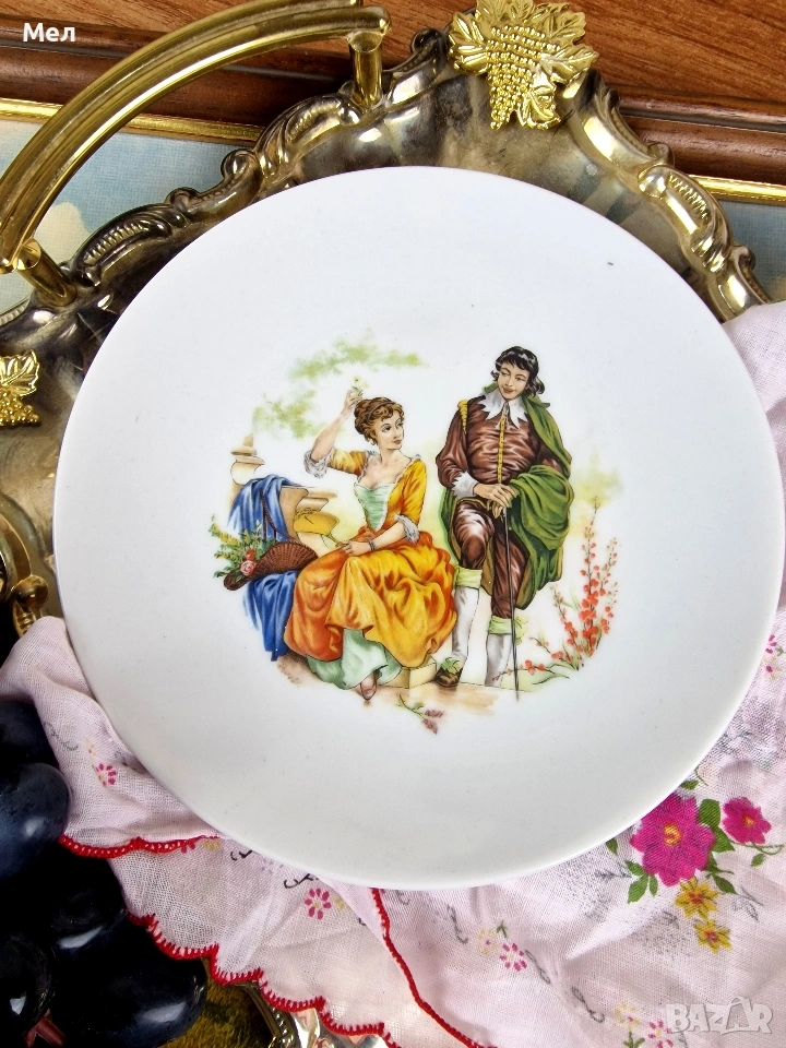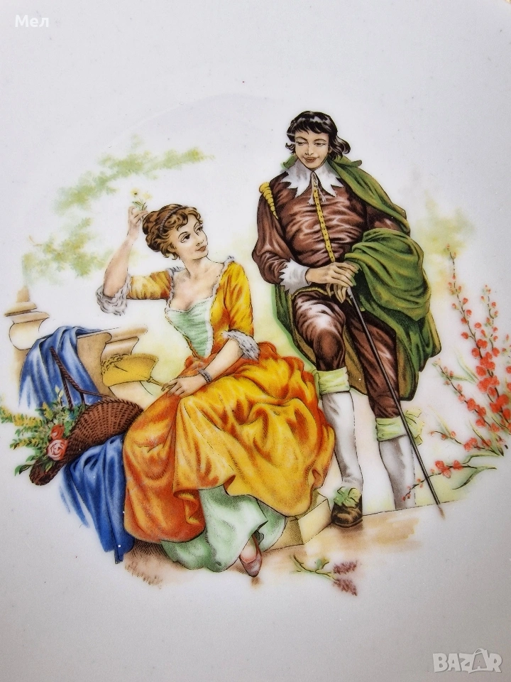 Изчистен порцелан декориран с романтична сцена в стил рококо, вдъхновена от Фрагонар.