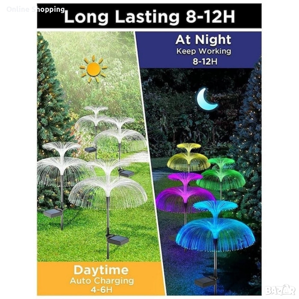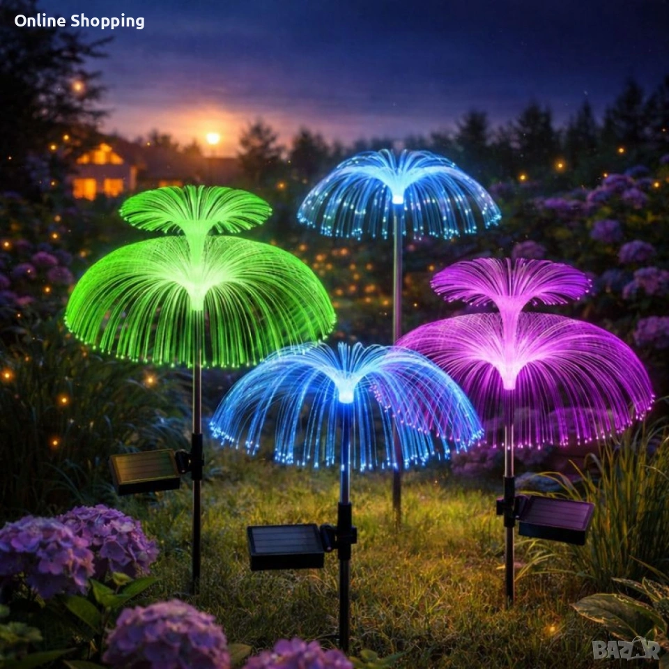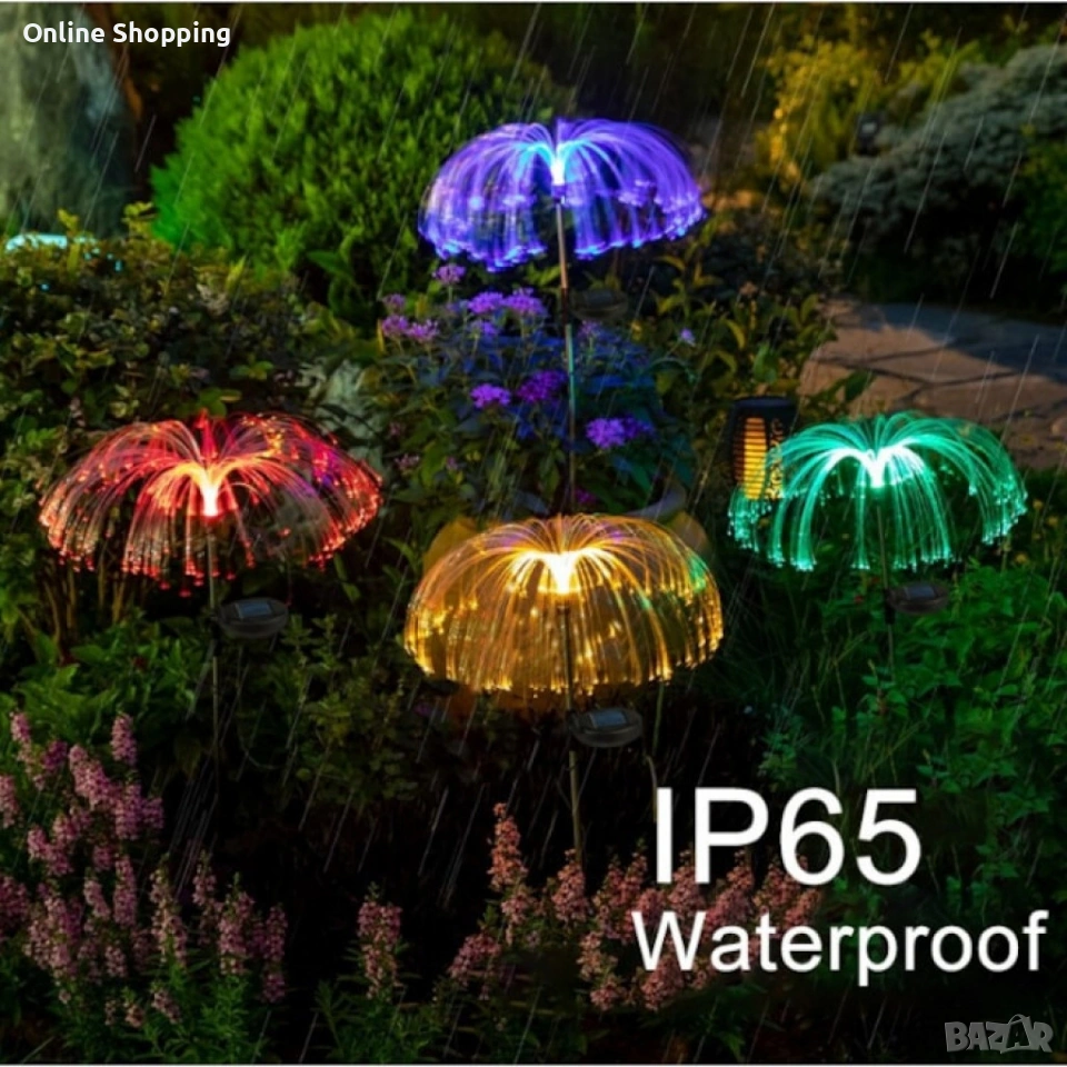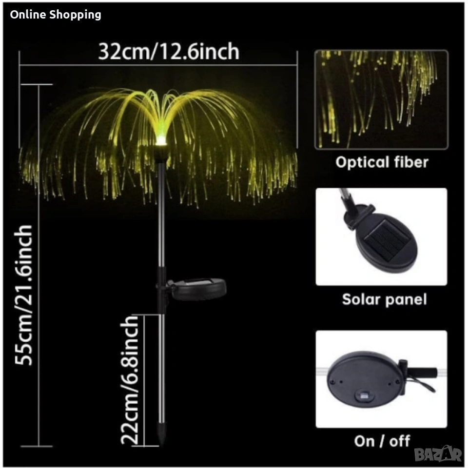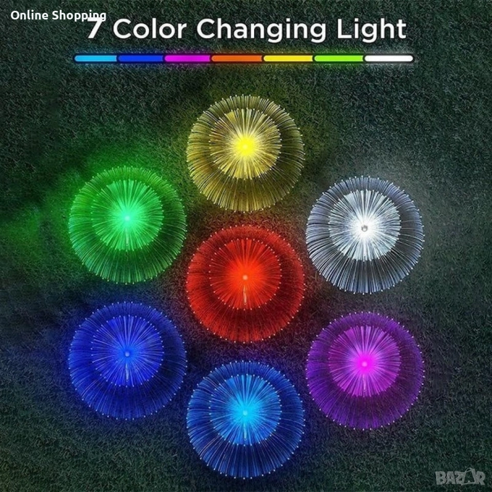 Тип осветление: RGB LED Брой цветове: 7 сменящи се цвята Захранване: Вграден соларен панел Материал: Оптично влакно и устойчива пластмаса Водоустойчивост: IP65 Автоматично включване/изключване: Да (вграден светлинен сензор) Време на работа: 8–12 часа след пълно зареждане Размери (приблизително): височина 55 см, диаметър на короната 32 см Варианти: 1, 2, 3, 4, 5 или 6 броя
