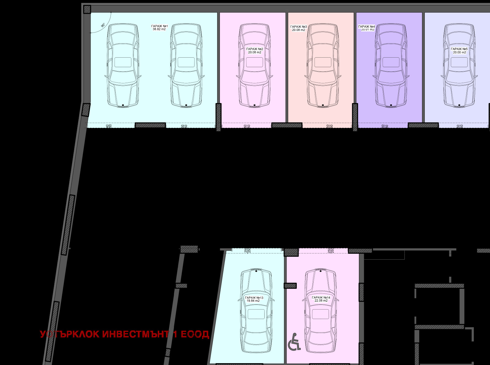 Сградата разполага с две нива подземни гаражи на цени от 23 000 до 43 000 хил. евро