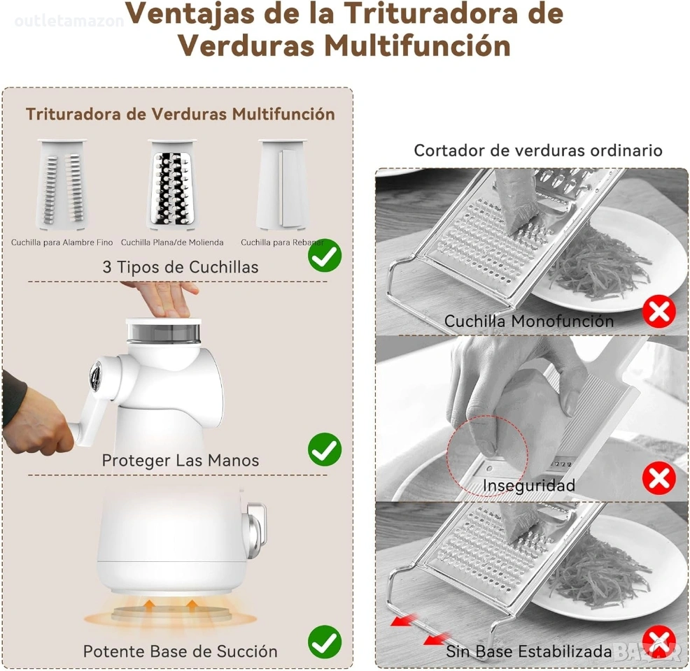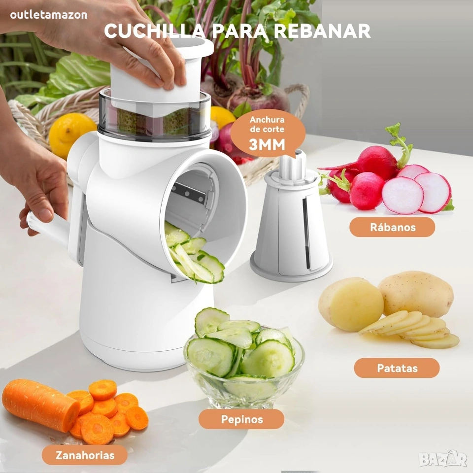 ренде съчетава три функционални остриета, с които можете да нарежете повечето зеленчуци, плодове, ядки и други, което го прави незаменим помощник в кухнята.