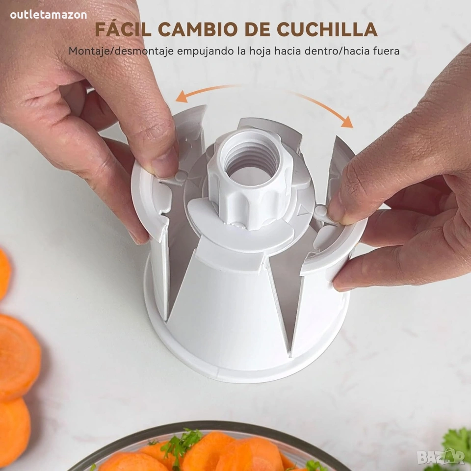 ВИСОКА БЕЗОПАСНОСТ: Когато използвате резачка за зеленчуци, вашият тласкач за храна изолира пръстите ви от контакт с остриетата, предпазвайки ръцете ви и предпазвайки ги от нараняване.