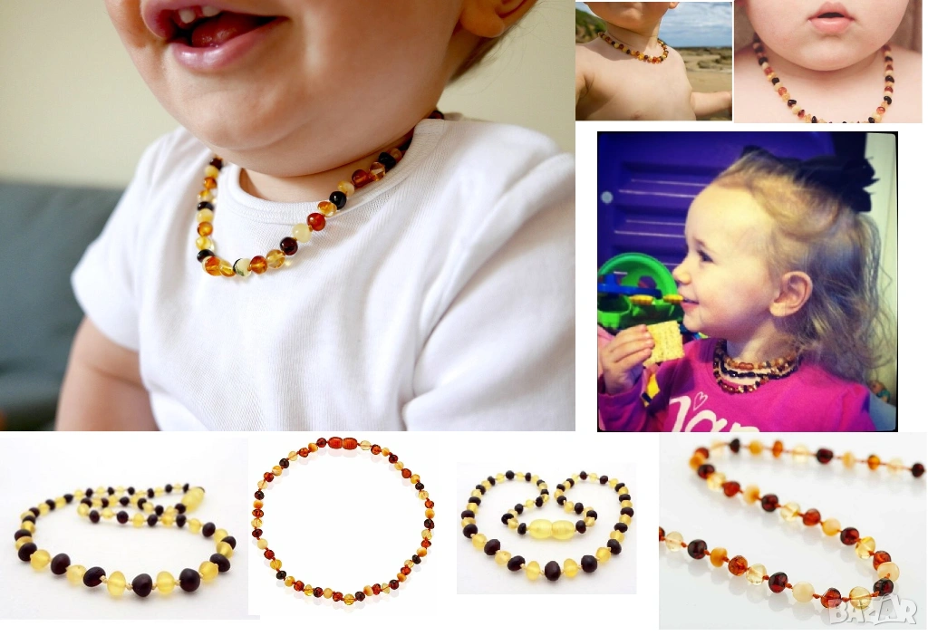 Детски - бебешки герданчета от кехлибар за никнене на зъбки и срещу коремни спазми/колики в два варианта: