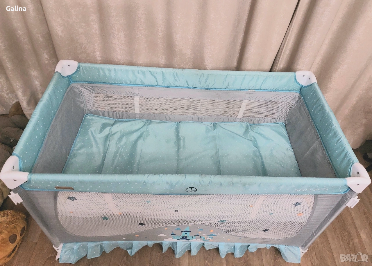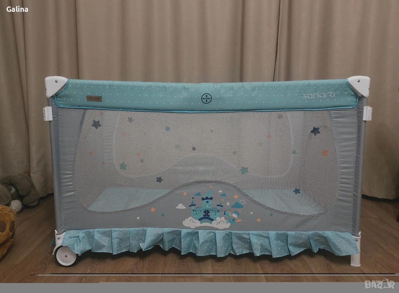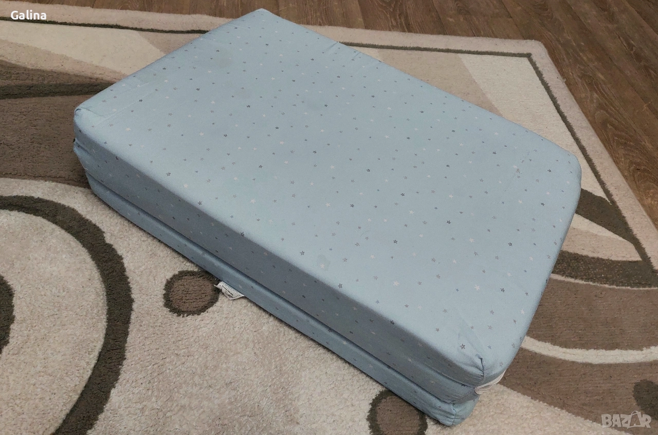 Сгъваема кошара на 2 нива, в цветове,подходящи и за двата пола. Размери 120 на 60см,без никакви забележки. От едната страна има вход със цип,от другата страничен голям джоб органайзер. Към нея давам сгъваем матрак,комарник и чанта за пренасяне. Цена за всичко 60€. За гр.Пловдив лично предаване