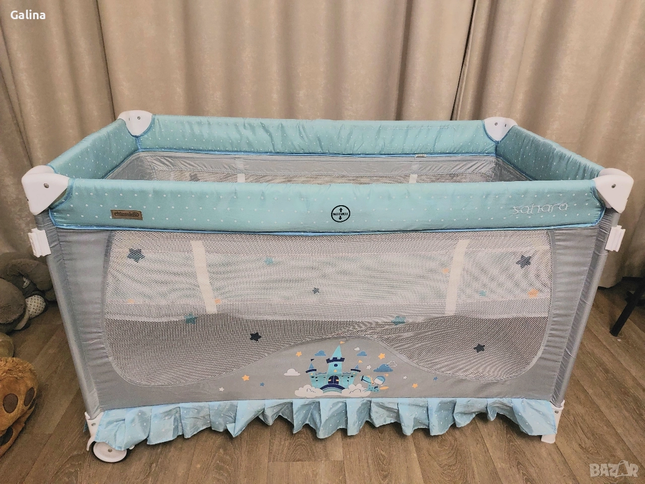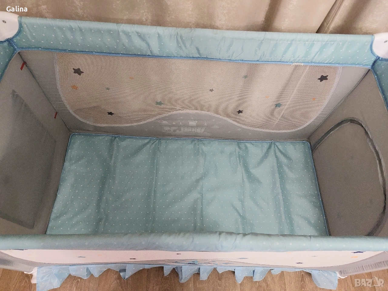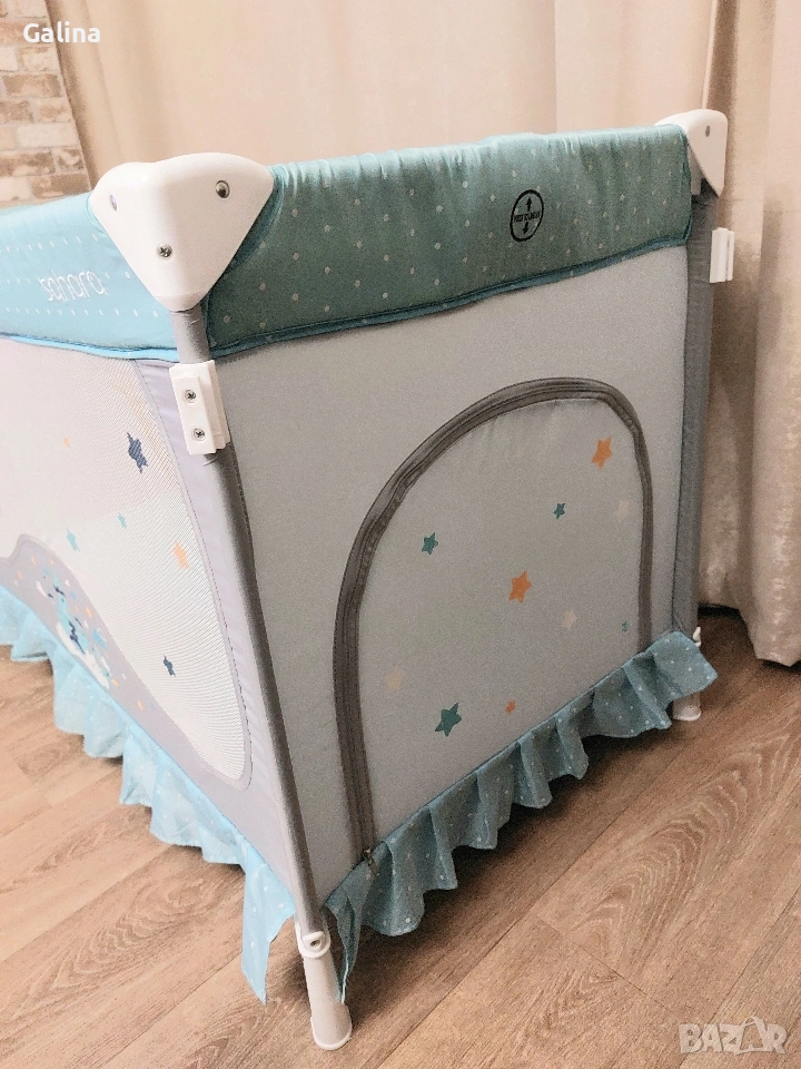 Сгъваема кошара на 2 нива, в цветове,подходящи и за двата пола. Размери 120 на 60см,без никакви забележки. От едната страна има вход със цип,от другата страничен голям джоб органайзер. Към нея давам сгъваем матрак,комарник и чанта за пренасяне. Цена за всичко 60€. За гр.Пловдив лично предаване