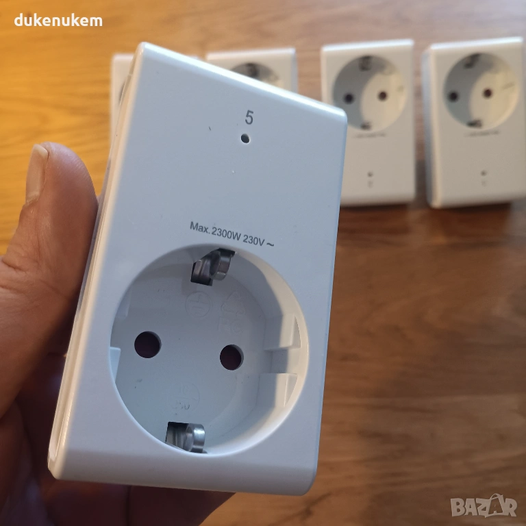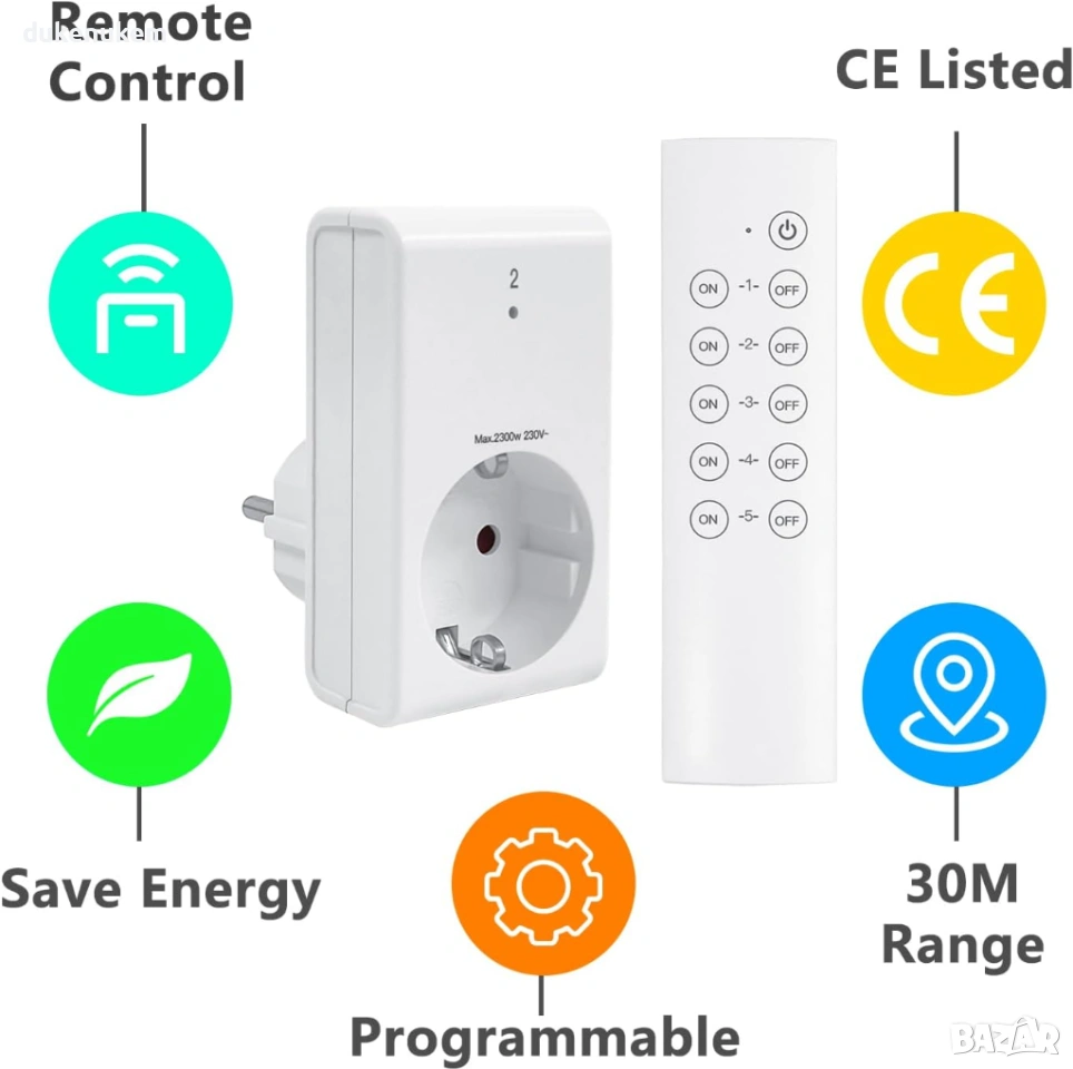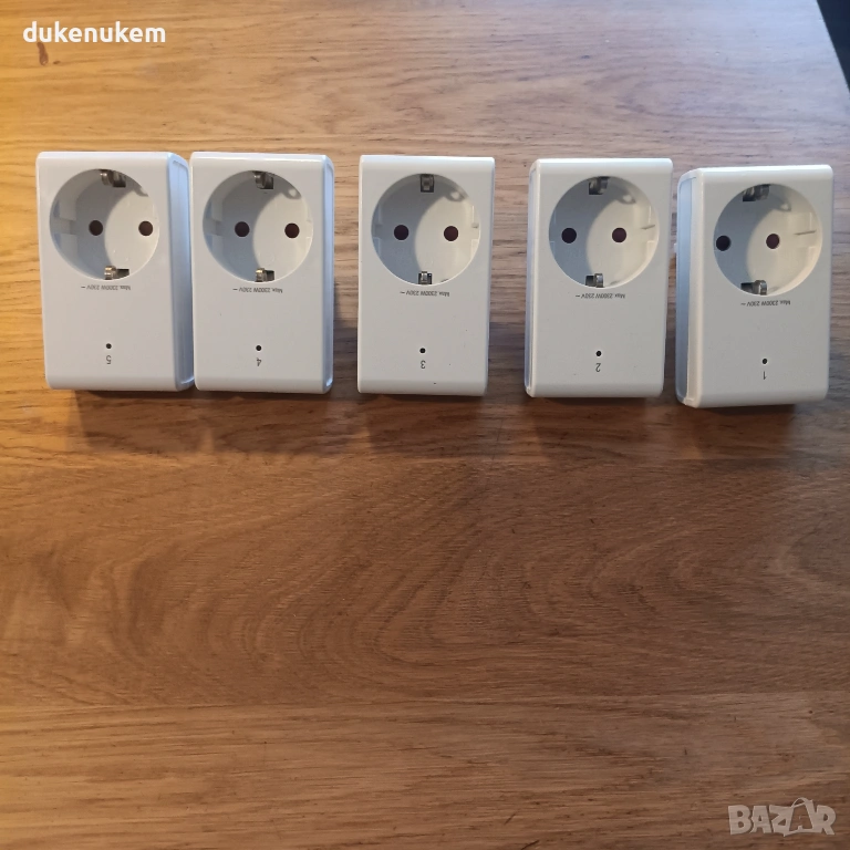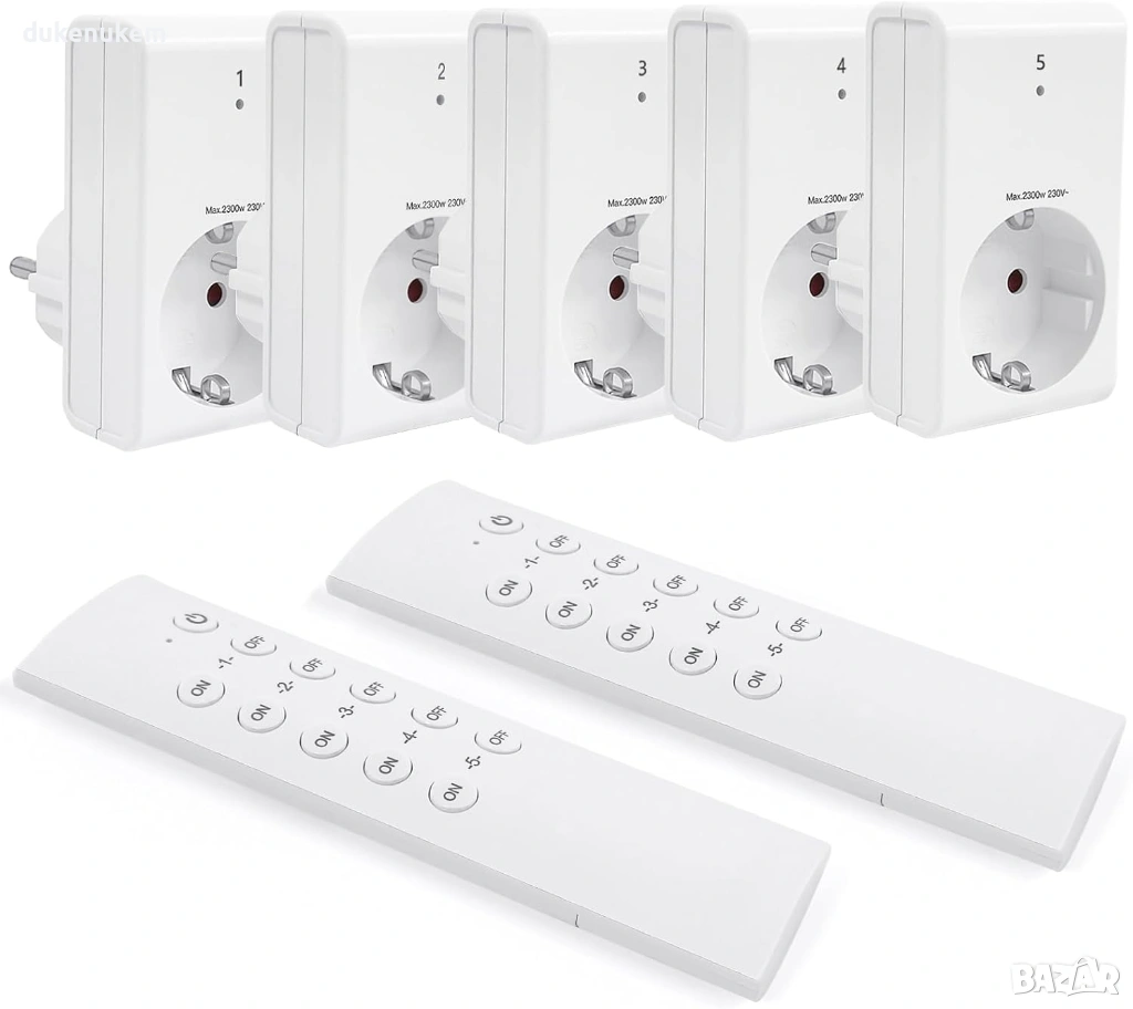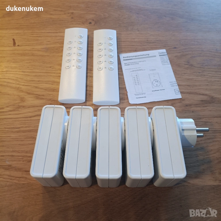 Практичен комплект безжични радио контакти с дистанционно управление, позволяващ удобно включване и изключване на уреди от разстояние.
