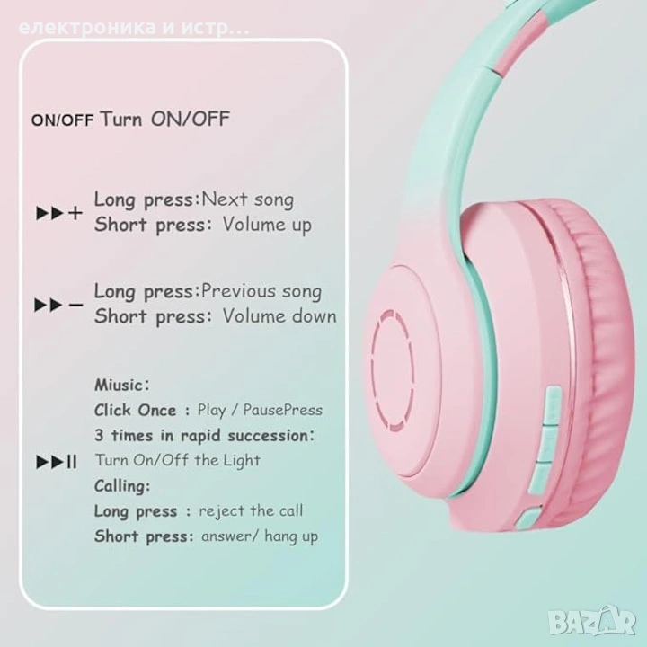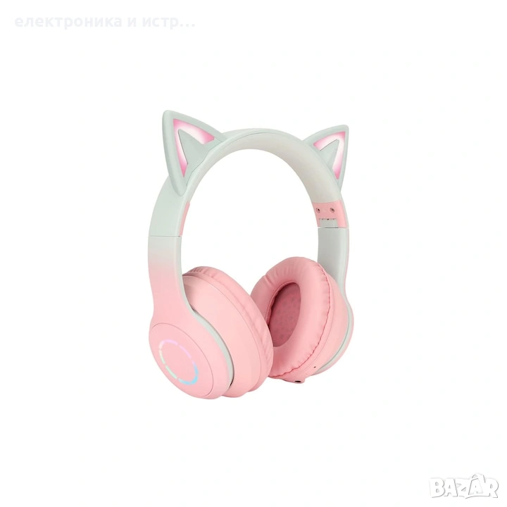Сгъваеми безжични слушалки с котешки уши, за деца, LED, Bluetooth
