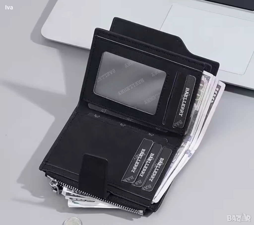 Портфейлът има отделения за карти, място за банкноти и прозрачен джоб за документ. Размерът му е удобен за носене в джоб или чанта, без да заема много място.
