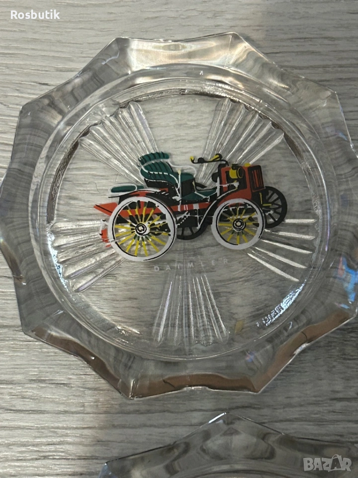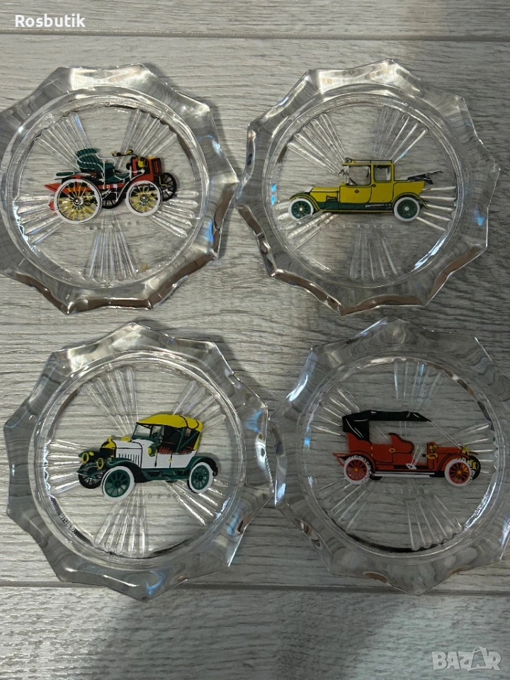 Старинни стъклени подложки за чаши с ретро коли 4 броя диаметър 9см.