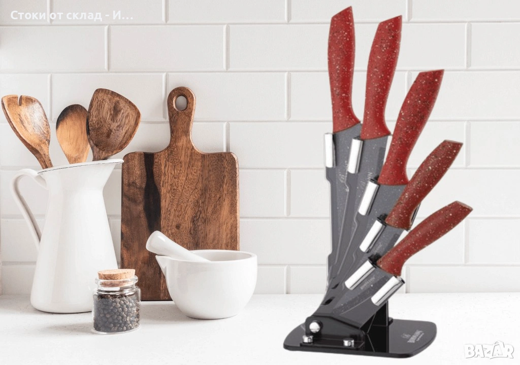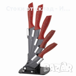 Ножове Комплект Bohmann, 5броя, Мраморно покритие, Акрилна поставка, Червена дръжка