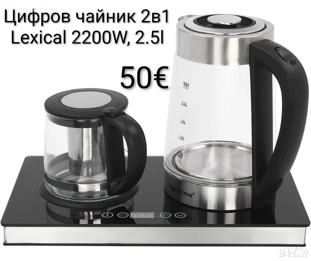 Цифров чайник 2в1 Lexical – 2200W, 2.5L, безжичен и с прозрачен индикатор