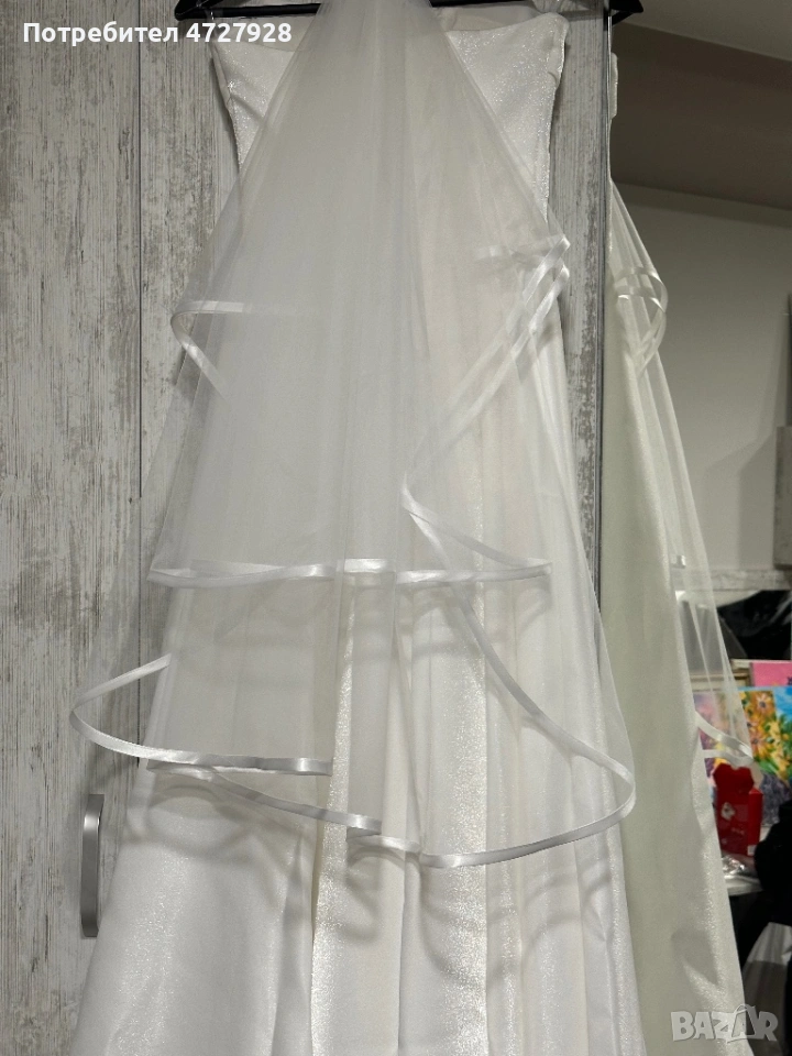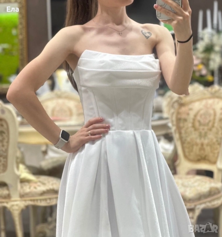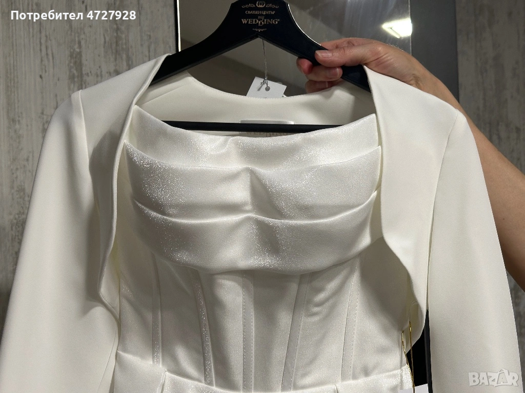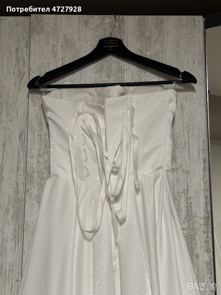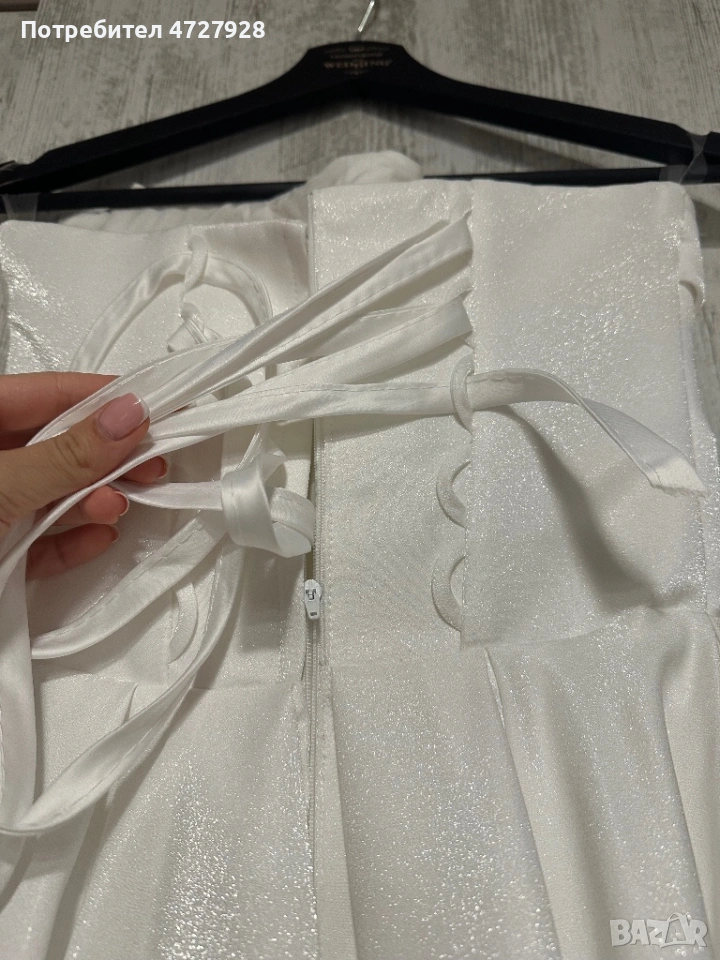 Продавам булчинска рокля. Отговаря на р-р XS. Omзaд e с корсет и с цип и може да се регулира. Цветът е перлено бяло.