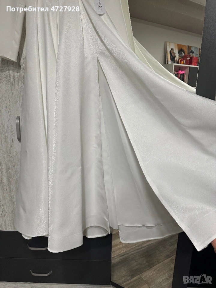 Отстрани по дължината има цепка. Чисто нова е, не е обличана (освен за пробата в магазина). Към нея продавам и воал, болеро, чанта и обувки - 38 р-р. Те също са чисто нови. Роклята е закупена за 1700 лв., а останалите аксесоари за 400 лв. Продавам я за 800 лв. Аксесоарите са подарък.