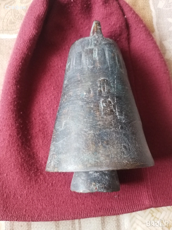 Звънеца е с размерите 14см. от ръб до ръб.Няма нито спукано,нито лепено а има много хубав звук.