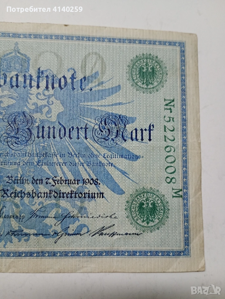 ГЕРМАНИЯ БАНКНОТА 100 МАРКИ 1908 Г → Обява 53348490