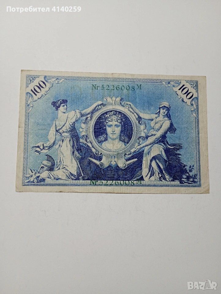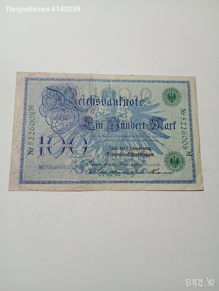 ГЕРМАНИЯ БАНКНОТА 100 МАРКИ 1908 Г РЯДКА СЪСТОЯНИЕ МНОГО ДОБРО ПОЛУЧАВАТЕ СНИМАНАТА БАНКНОТА РАЗГЛЕДАЙТЕ ДРУГИТЕ МИ ОБЯВИ ДА КОМБИНИРАТЕ ДОСТАВКА ЕКОНТ ЗА ВАРНА ЛИЧНО
