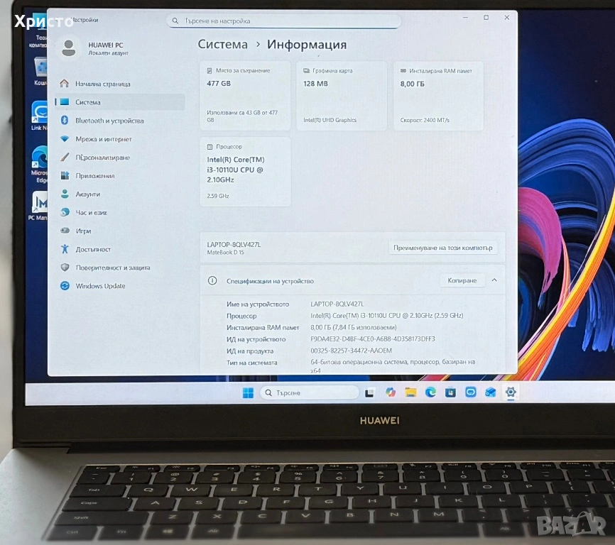 Huawei MateBook D 15 – изключително запазен лаптоп, използван внимателно и поддържан перфектно. Машината работи бързо, плавно и стабилно – подходяща както за работа, обучение, така и за ежедневна употреба (офис, интернет, филми и др.). Лаптопът е много добре гледан, без никакви забележки – нито технически, нито козметични. Реално може да се каже, че е като нов. Активиран оригинален Windows 11. Бърз NVMe SSD – стартира за секунди.