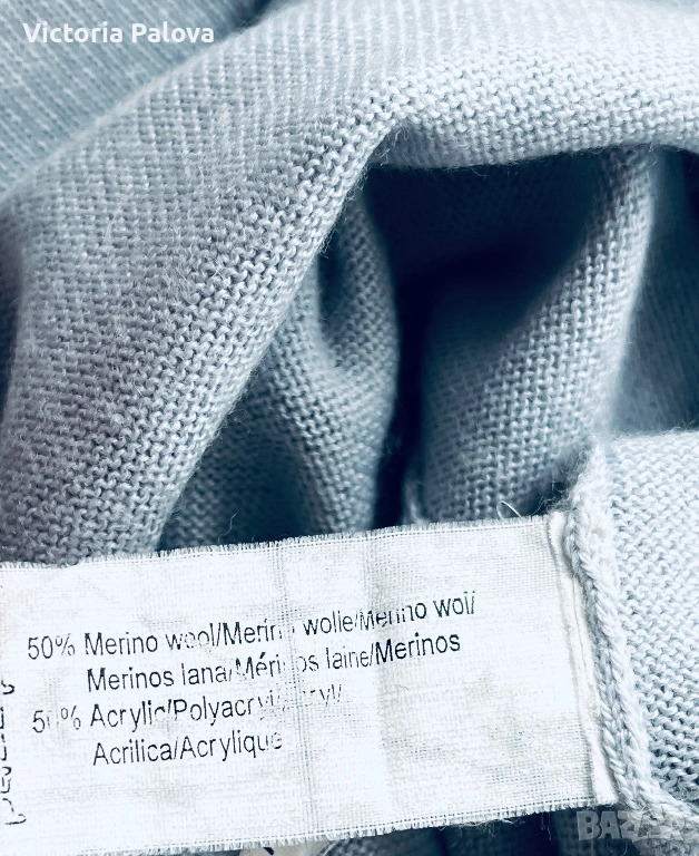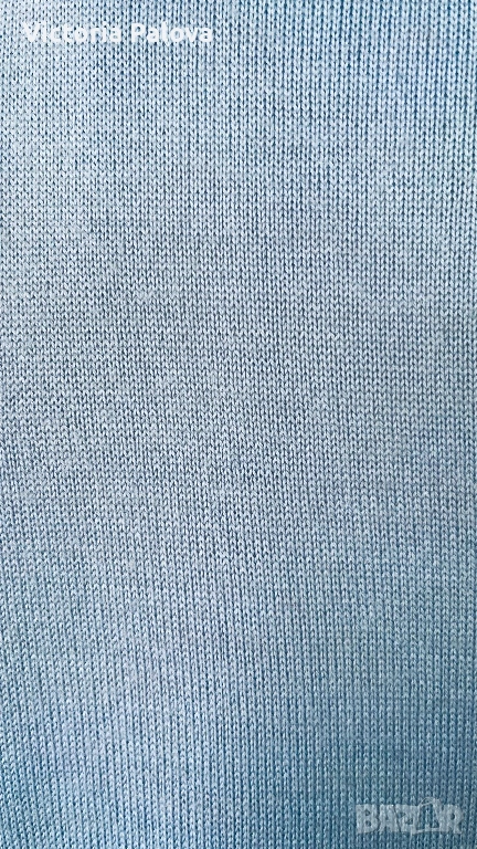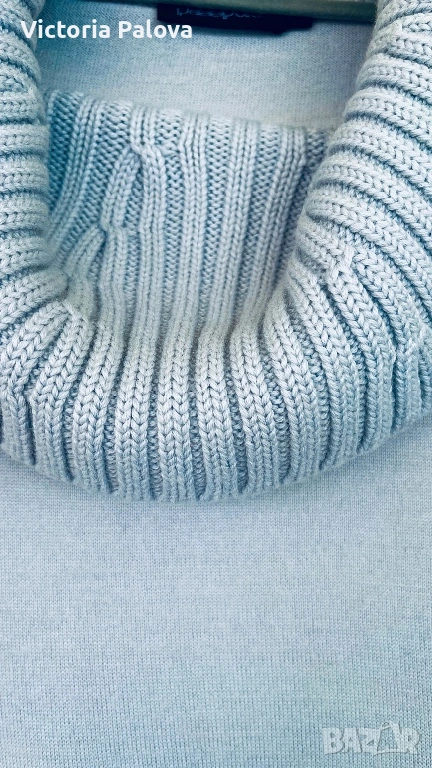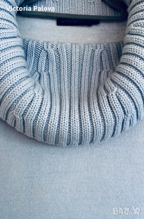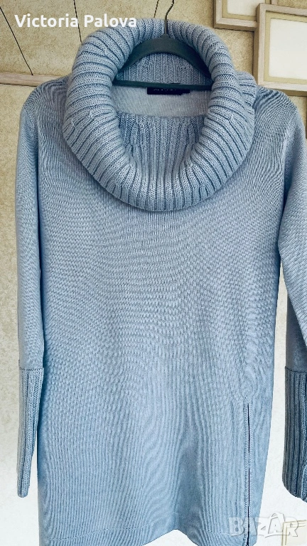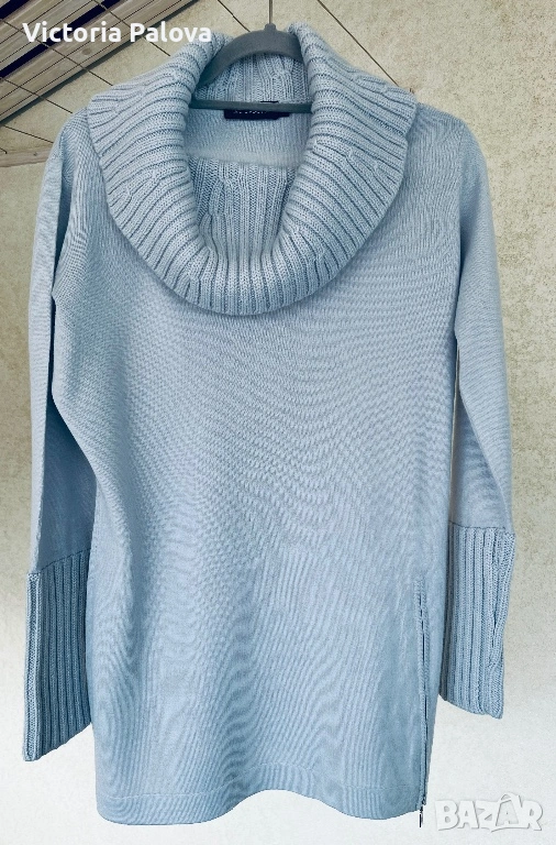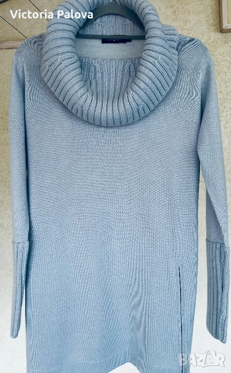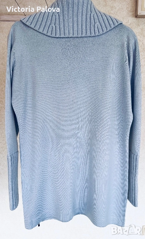 Перфектен елегантен дамски пуловер/блуза за уютен и стилен вид през студените дни. С висока плетена яка, дълги ръкави с рипс маншети, странична цепка с цип. Състав : 50% нежна гладка мериносова вълна и 50% акрил - комбинация, която прави дрехата топла и издръжлива. Цветът е свеж небесносин ( pastel blue). Рамо - 44см, ГО - 57см, дължина - 74см, ръкав - 62см, маншетът е 21см и се подгъва по желание, яка - 21см.