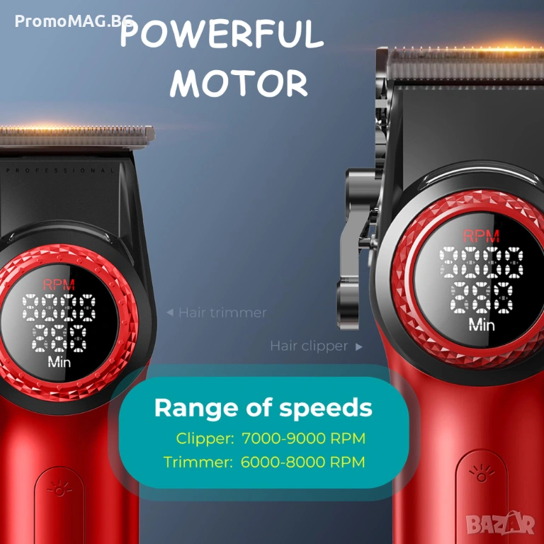 Професионална машинка за подстригване VGR PRO V-001: Многоскоростно регулиране (21 степени), интелигентен LED дисплей, регулируем лост за конусност, мощен двигател до 9000 об/мин, Type-C зареждане. Включва 10 направляващи гребена (1.5 – 24 мм).