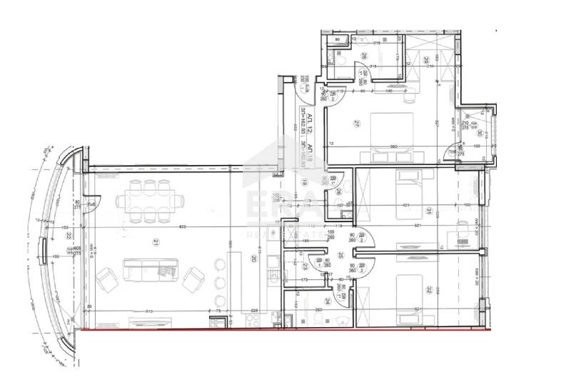 Апартаментът е разположен на осми етаж от общо единадесет. Състои се от просторна дневна с кухненски бокс от 50 кв.м с излаз към балкон и гледка към Витоша, три спални, две бани с тоалетна, отделно толаетна, коридор и складово помещение. Изложението е юг. Всички апартаменти се издават с ниско-температурно (29-31?) подово отопление и охлаждане/климатизация с конвектори към хибридна термопомпа на газ и ток с индивидуално котле на газ. Подовото отопление е във всяка стая и санитарно помещение. Лири от висок клас в санитарните помещения.