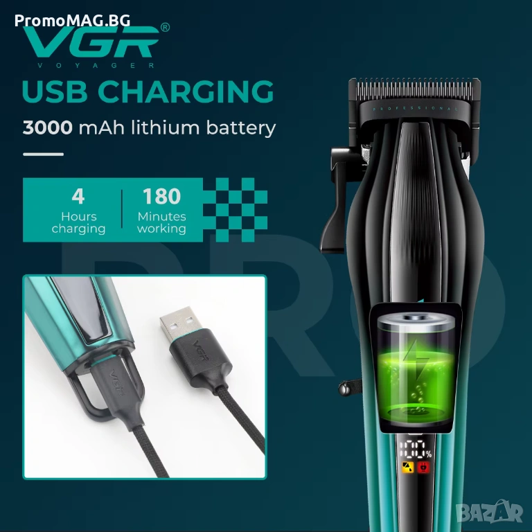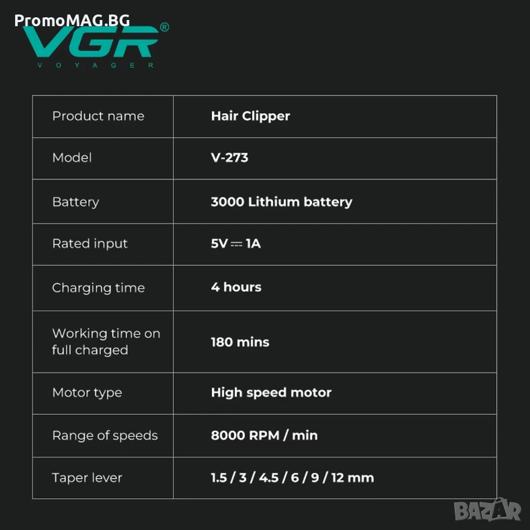 Машинката VGR V-273 е предназначена както за професионални фризьори и барбери, така и за домашна употреба. Моделът е с метален корпус, здрава конструкция и много удобна форма за работа.