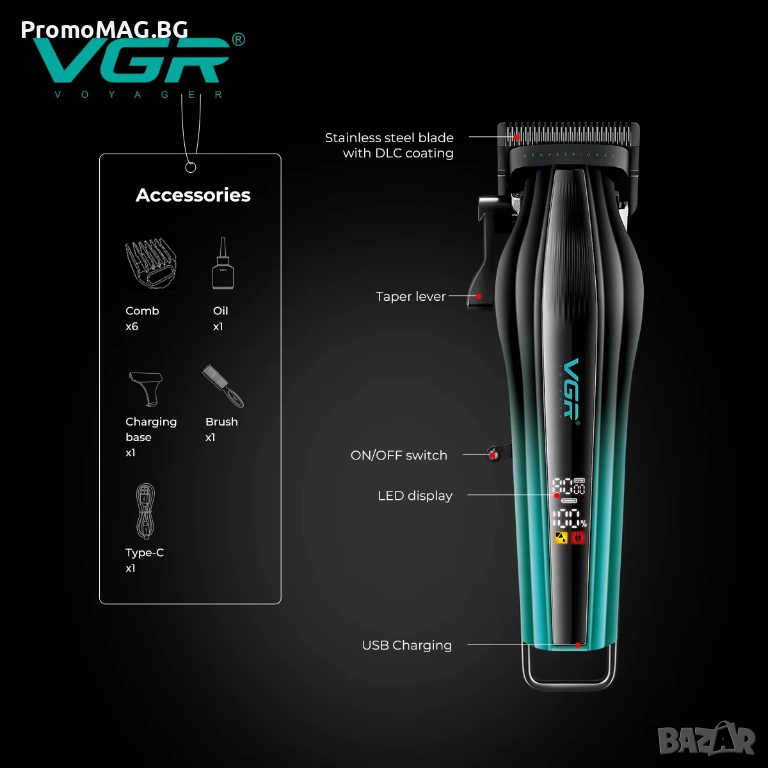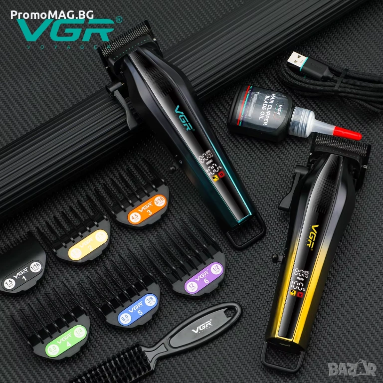 В комплекта са включени машинка VGR V-273, 6 броя приставки, защитна капачка за ножа, четка за почистване, масло, USB-C кабел и инструкции.