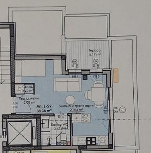 Жилището е с площ от 42 кв.м. като разпределението включва: Входно антре, хол с кухненски бокс и място за спалня, баня с тоалетна, тераса, склад.