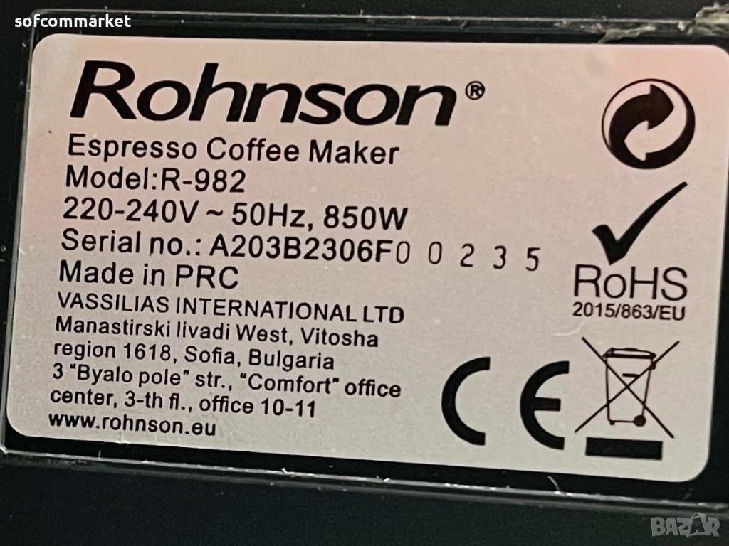 Ръчна еспресо кафемашина Rohnson R-982, използвана, но в отлично състояние и напълно обслужена, готова за употреба.