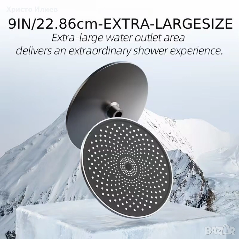 Голяма душ пита (душ тип "дъжд") с технология за водоспестяване без компромис в налягането. Въздушна система с омекотител против варовик, предотвратяваща запушване