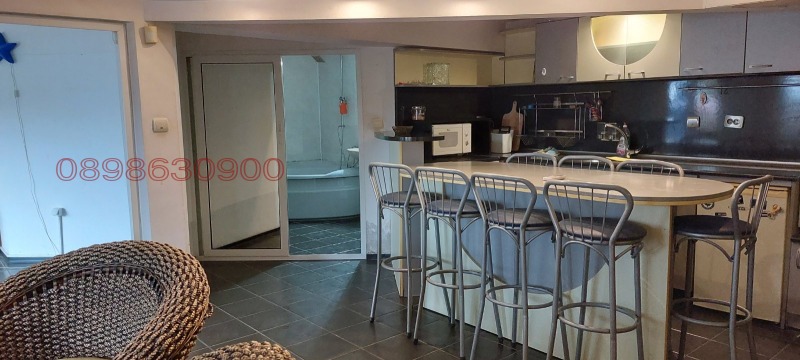 Кухнята е изцяло обзаведена и оборудвана с уреди /печка, хладилник, миялна машина и перална/