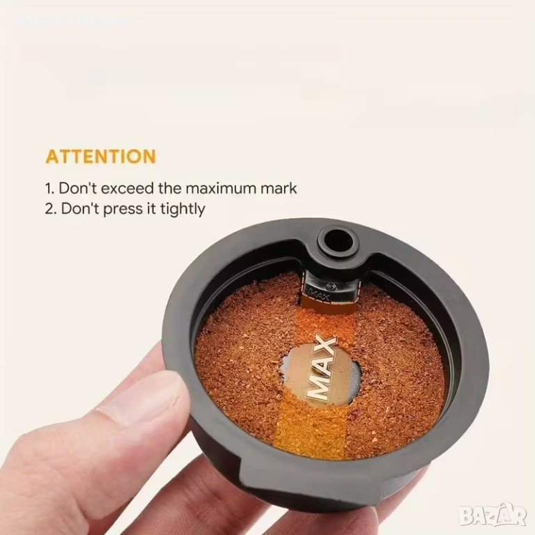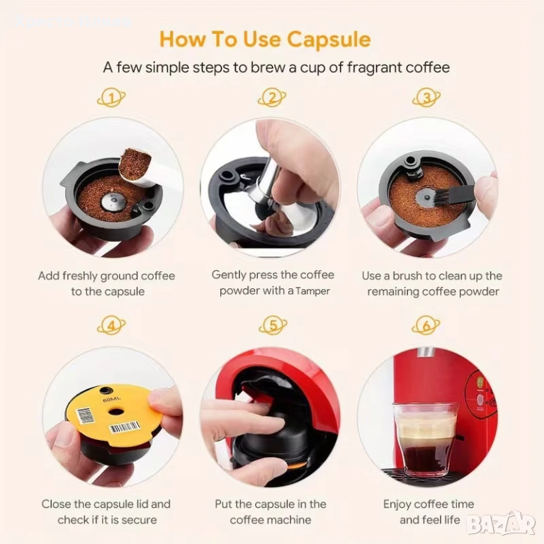 Капсулата е изработена от висококачествени материали. Слагате кафе и затваряте капачето, след това измивате.На снимката е показано точните стъпки за използване.