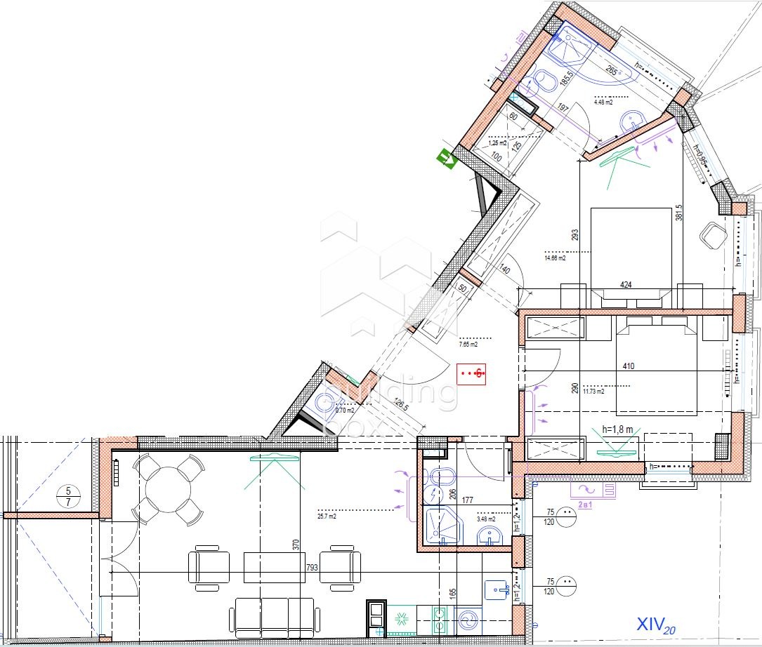 Състои от антре, дневна с кухненски бокс, две спални, две бани с тоалетна и лоджия.