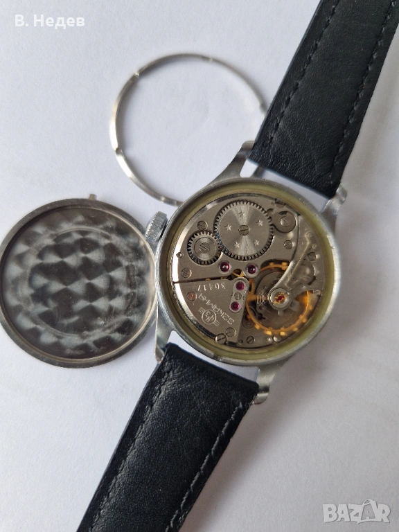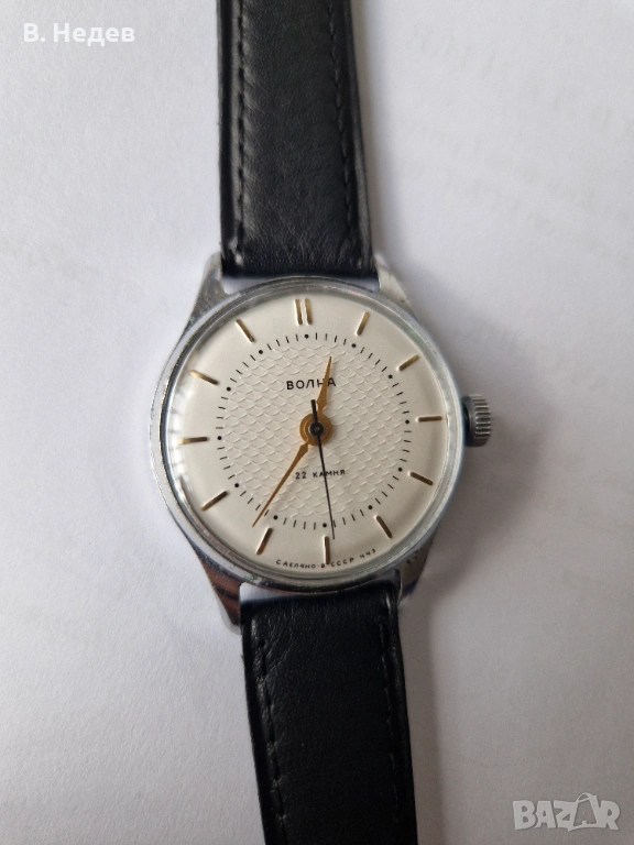 Продаваме този супер запазен руски /съветски/ часовник ВОЛНА, 22 камня, сделано в СССР, ЧЧЗ /Чистополски часови завод! Ръчно навиване, отлично състояние - циферблат, индекси, стрелки, машина - супер състояние; моля разгледайте подробно снимките! Часовника е висок клас, с мн. качествена машина - калибър 2809, със 22 рубинови камъка, противоударен прецизен баланс, централна секундарна стрелка, амортисьор на баланса. Надеждна и безотказна машина. Вибрации на баланса - 19800/, сравнително голям баланс - диаметър на баланса - 14 мм; Восток/Волна 2809 е копие на легендарния хронометър на Zenith - 135 - този механизъм в продължение на 5 години от 1950г. е с по-добри показатели от Omega, което е сензация за онзи период. През 1950г. в Neuchatel, Switzerland Zenith 135 печели първото място, като измества Omega, която неотменно държи първенство от 1945г. Часовника е след профилактика /преди месец/ и поддържа мн. точно време - за този калибър по спецификации е - до +10-10sec/ 24 h.; за конкретния часовник отклонението е мако повече - до +20-22 сек. Запас на хода - около 38- 39 часа. Надписите върху циферблата: ВОЛНА 22 камней, сделано в СССР, ЧЧЗ. Топ дрес часовник!