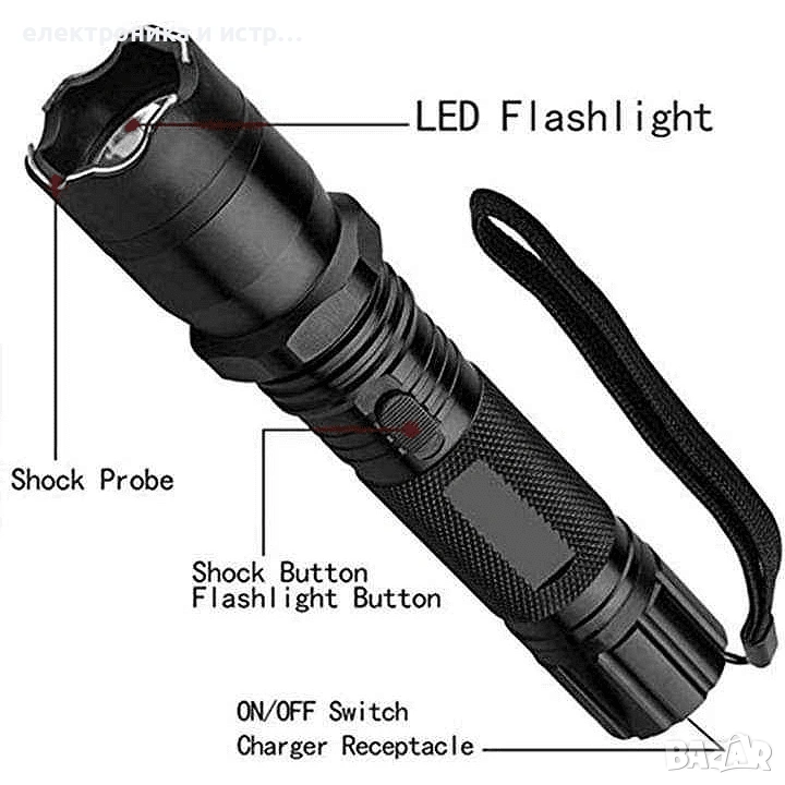 Компактен и удобен за използване електрошок във формата на LED фенер. Ефективно средство за самоотбрана