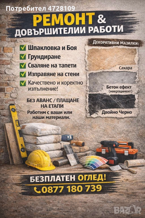 | Шпакловки, боядисване и декоративни мазилки - без аванс