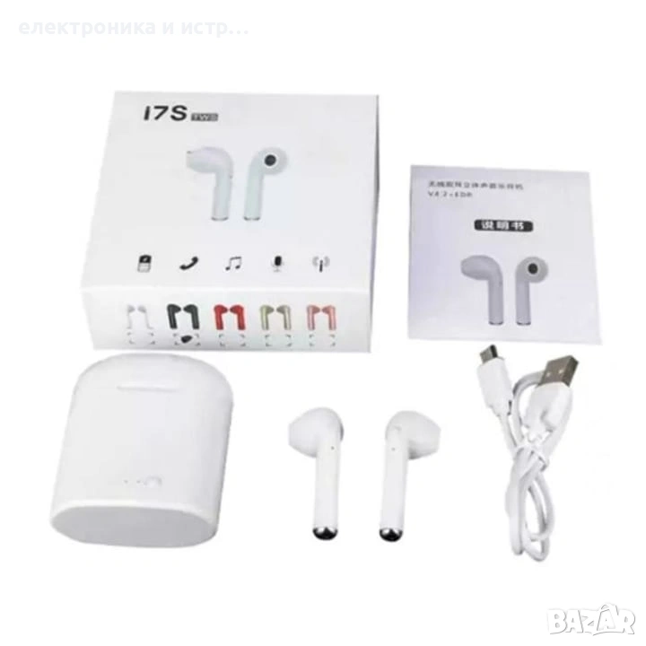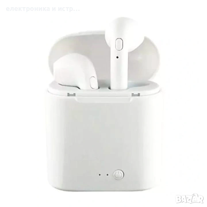 Безжични bluetooth слушалки i7S. Слушалките за подходящи за спорт, шофиране, hands free разговори, слушане на музика и други. Изключително удобни, работен обхват - около 10м. В комплекта са включени зарядно и стилна кутийка за съхранение. Предлагат се различни цветове, в картонена кутия.