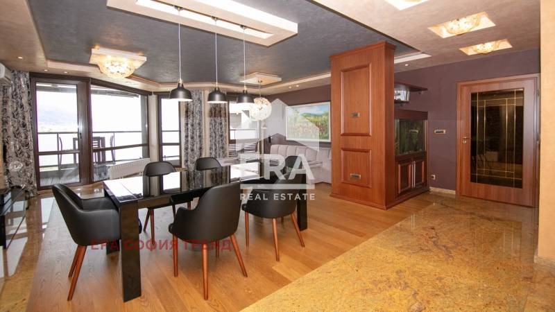 Апартаментът е ситуиран на пети етаж в девететажна сграда, с разгърната площ от 192.8 кв.м и функционално разпределение, което включва: представително входно антре (10.7 кв.м), обширна дневна с трапезария и кухня (55.9 кв.м), три изключително просторни спални (съответно 23, 21 и 19 кв.м), от които едната е мастър спалня със самостоятелна баня (4.2 кв.м), втора баня, оборудвана с джакузи (6.2 кв.м.), мокро помещение (1.9 кв.м), склад (3.7 кв.м) и три тераси (8.9, 7.05 и 4.8 кв.м), от които се разкрива спираща дъха панорамна гледка към Витоша. Допълнително към имота се предлагат две складови помещения, с площи 5.4 кв.м и 5 кв.м, ситуирани на сутеренно ниво.