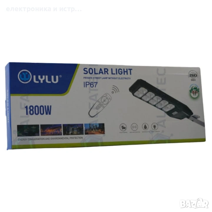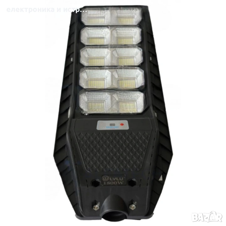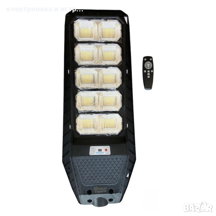 Мощност 1800W и висока яркост благодарение на мощните LED диоди, които осигуряват отлично осветление на големи площи. Поликристален панел, който осигурява бързо зареждане и максимално оползотворяване на слънчевата енергия. Водоустойчивост IP67 за защита от прах и водни струи, което прави лампата устойчива на всякакви метеорологични условия. Разнообразие от режими - димирана светлина на 30%, 100% осветление при засичане на движение, постоянна светлина 100% през целия тъмен период, както и таймер за автоматично управление. Вграден контролер за оптимален соларен добив и управление на енергията. Включено дистанционно за лесно превключване между режимите и управление на лампата от разстояние.
