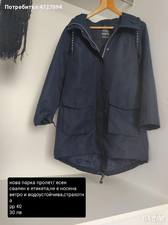 Парката е възможно най-високо качество материя за парка.Етикета е свален,но не е носена.Ветроустойчива и водоустойчива.Ценат не подлежи на коментар, струва. пъти повече.Идеална з разходки, планина и ветровито и влажно време.