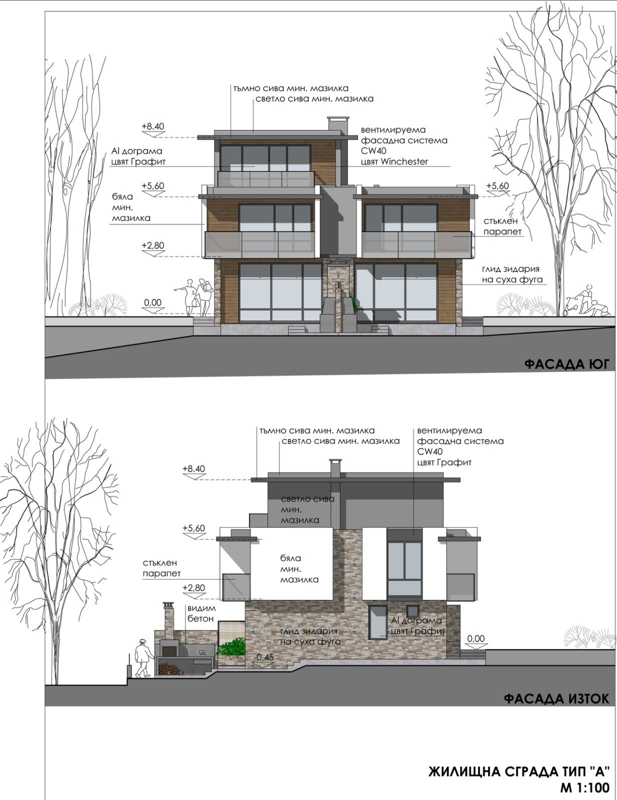 *Сграда тип А се състои от два самостоятелни жилищни обема с обща стена, като едната е на два етажа а другата е на три;