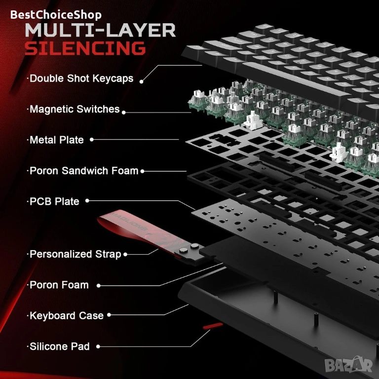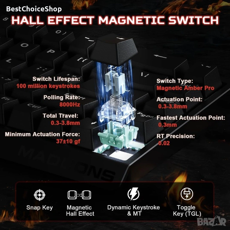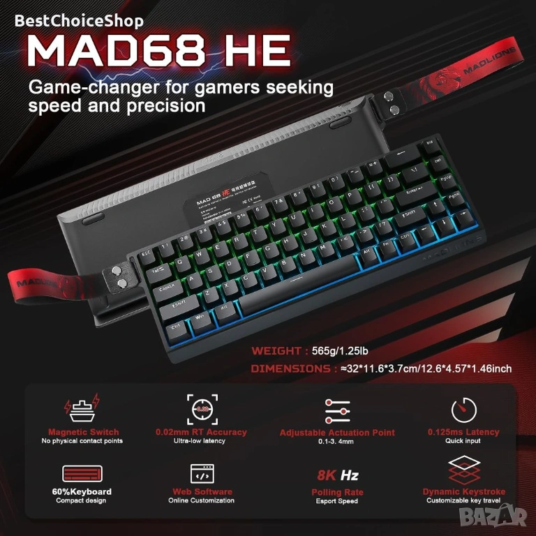 Професионална геймърска механична клавиатура MAD 60 HE RGB, подходяща за игри и ежедневна употреба. Стилен дизайн и удобство при използване. Със светещи RGB LED подложки за клавиши, които може да персонализирате според вашите предпочитания. Идеален избор за геймъри и хора, които търсят надеждност и качество.