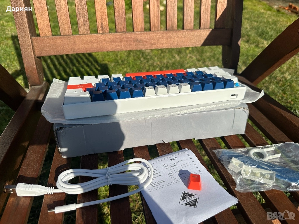 Клавиатурата е чисто нова, с Cherry MX Blue switch-ове е и има прекрасен звук. Идва пълен комплект който съдържа, кабел, капачки, инструмент за махане на капачки и упътване за използване.