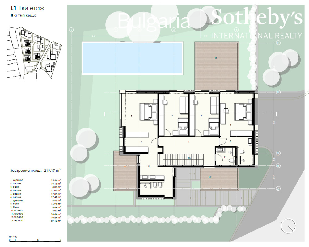 Първи етаж: родителска спалня с дрешник и собствена баня; спалня 1;спалня 2; спалня 3 с гардероб и собствена баня;баня обслужваща спалня 1 и 2.