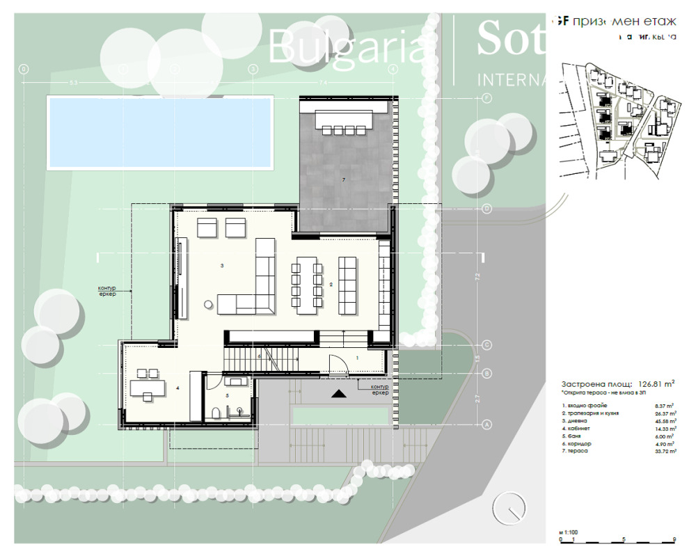 Партер: хол с трапезария; кухня; кабинет; баня; BBQ зона/веранда.