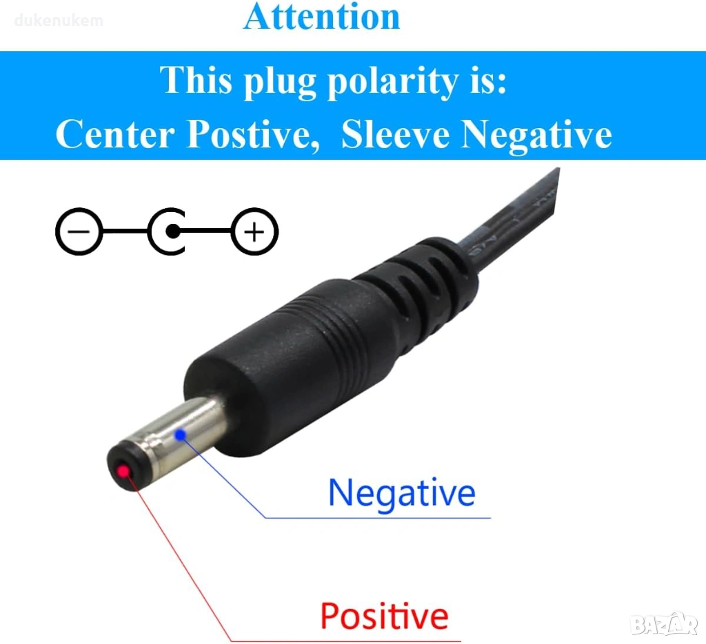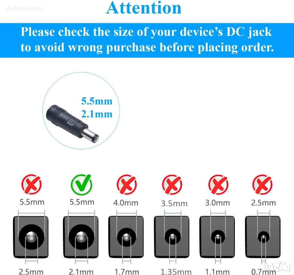 Конектор: 5.5 mm (външен) x 2.1 mm (вътрешен)