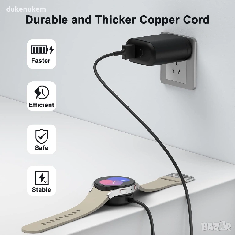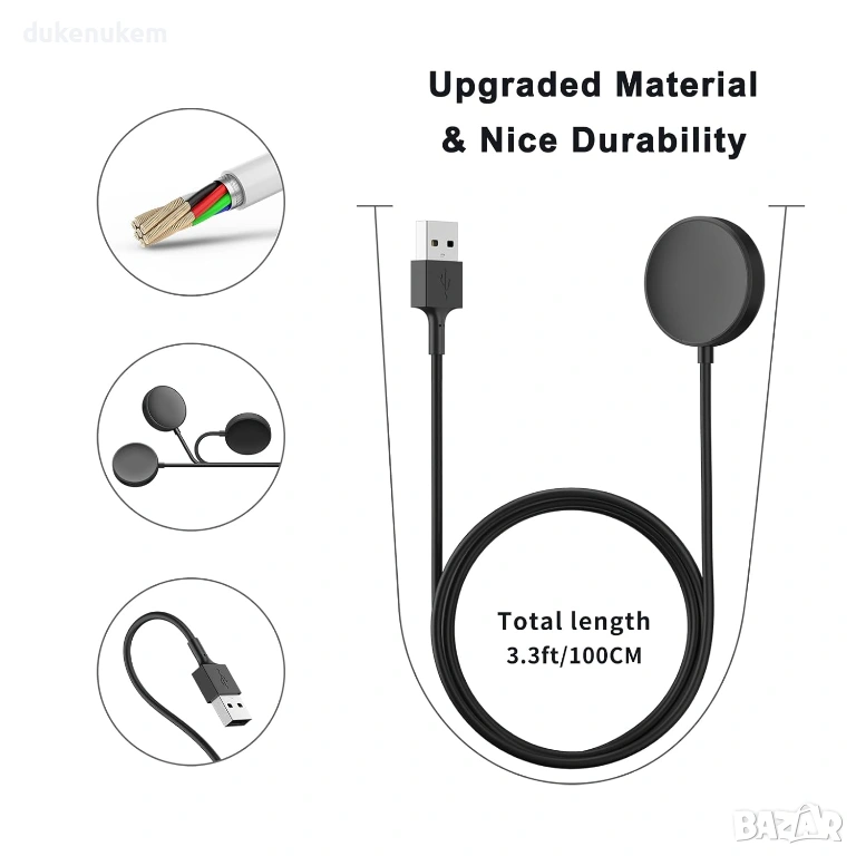 Магнитен USB зареждащ кабел Oumida, съвместим с широк набор от модели Samsung Galaxy Watch. Благодарение на вградения мощен магнит, часовникът се фиксира стабилно и започва да се зарежда автоматично, без нужда от прецизно нагласяване.