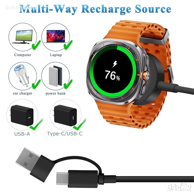 Безжичен бързозареждащ кабел PDKUAI за Samsung Galaxy Watch, проектиран за стабилно и сигурно зареждане. Вграденият мощен магнит фиксира часовника автоматично върху зарядната подложка и осигурява постоянен контакт по време на зареждане.