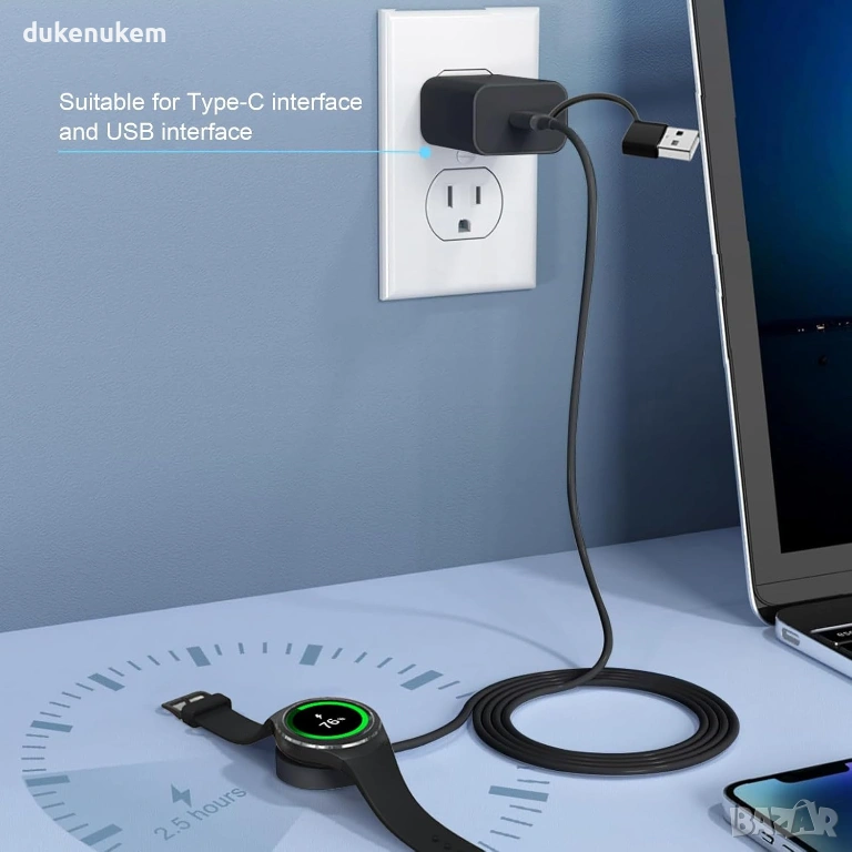 Кабелът поддържа бързо зареждане, като напълно зарежда часовника за по-малко от 2.5 часа. След достигане на 100% зареждането спира автоматично, предпазвайки батерията от презареждане. Подходящ за използване у дома, в офиса, в колата или при пътуване.