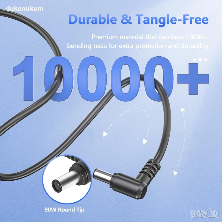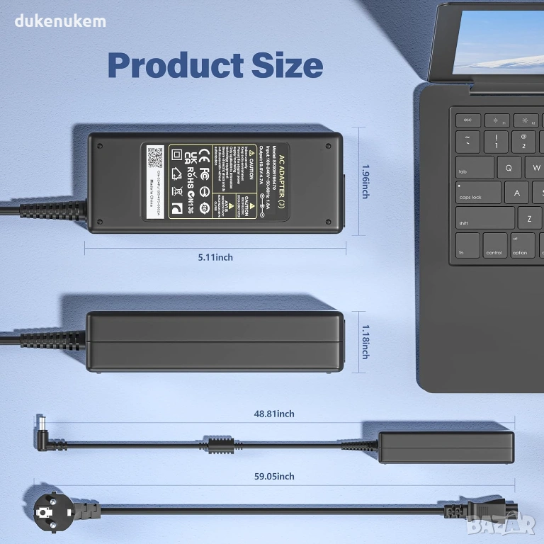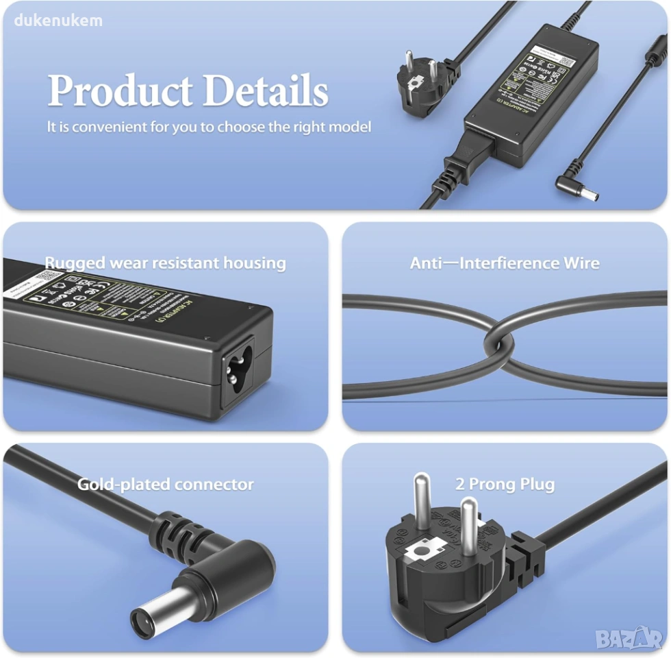 Важно: Моля, проверете напрежението (V) и размера на конектора (6.5 х4.4 mm) на вашето оригинално зарядно преди покупка.